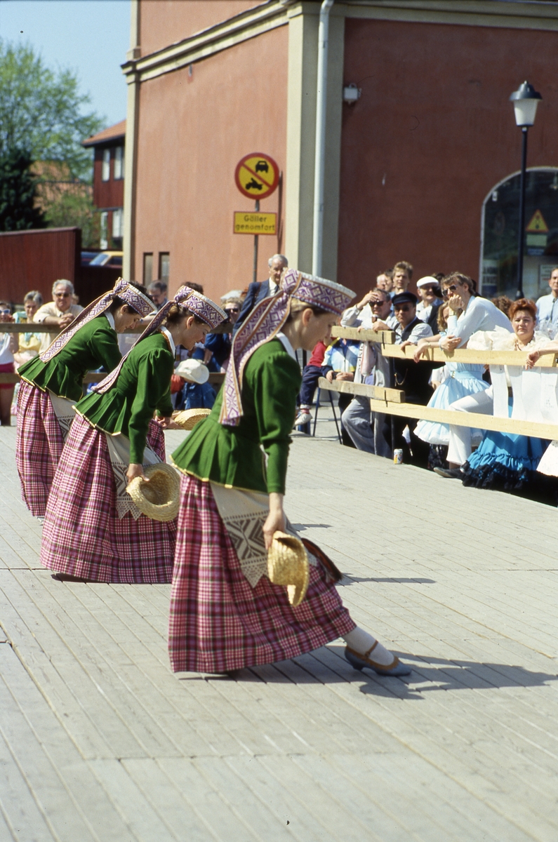 Tre kvinnor, i folkdräkt, har dansuppvisning på en uppbyggd scen på Stora torget. Publiken står nedanför och tittar på. I bakgrunden syns infarten till Västerlånggatan.