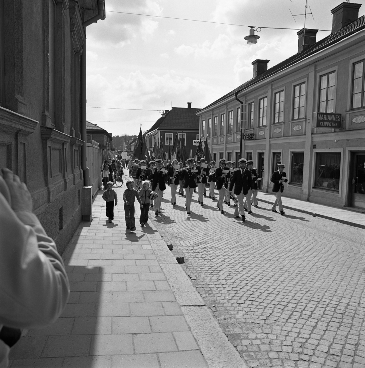 Första maj. Demonstration. Arboga Blåsorkester går i täten. De är i jämhöjd med kvarteret Stadsgården. Mariannes Klippotek, Jeansshoppen och en damfrisering ligger i byggnaden. Demonstrationståget är på väg över Kapellbron, upp mot centrum. Fanor och plakat syns bakom musikkåren.