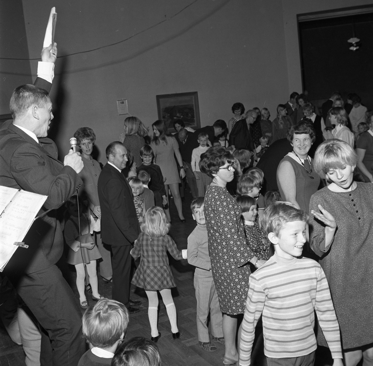 FCTF har julgransplundring. Alla åldrar dansar ringlekar. Kurt Gren är dansledare. Mannen framför honom, är Lärnemark (som arbetar på underhållsavdelningen). Bakom honom står Margareta Lindberg.