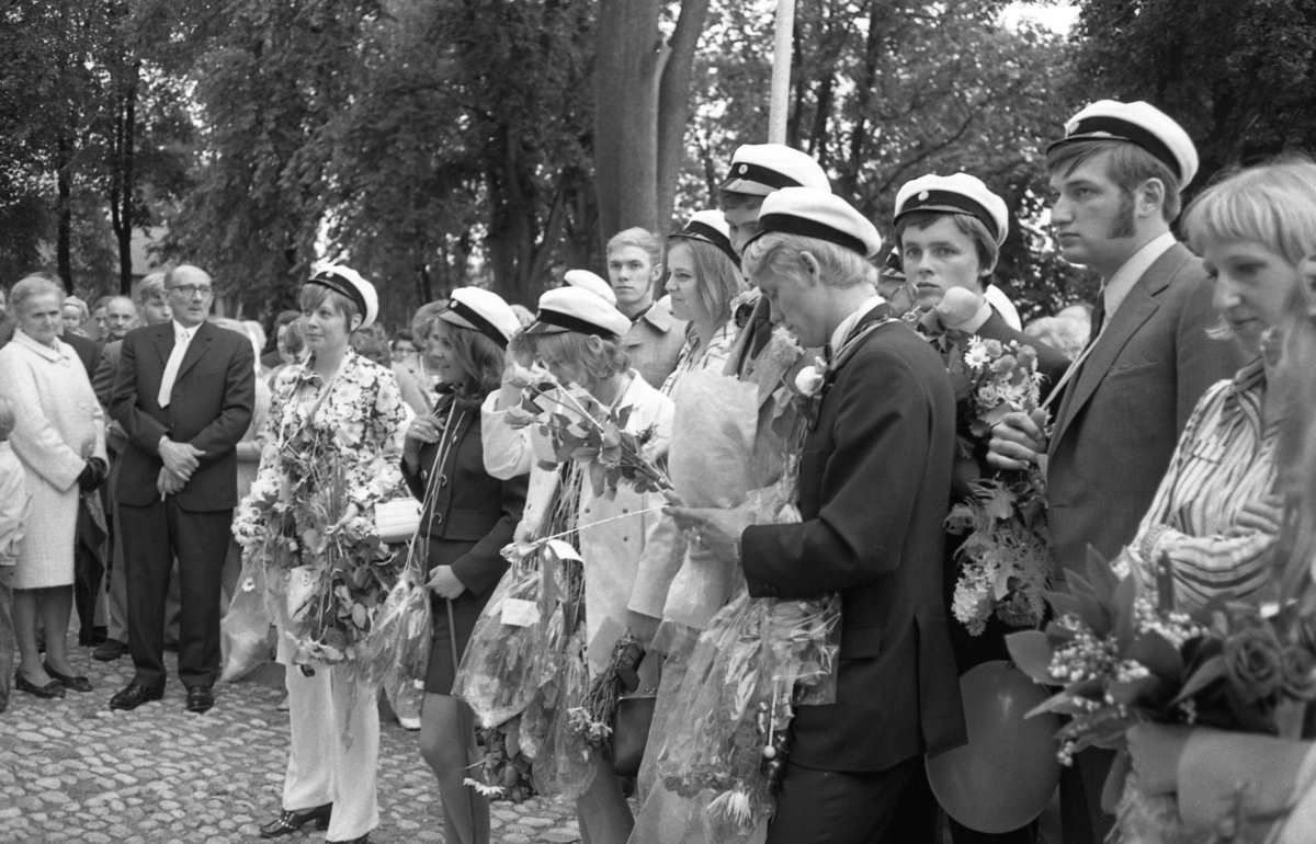 Studenter utanför Heliga Trefaldighetskyrkan. De är iklädda studentmössor och har blombuketter hängande om halsarna. Från vänster: Gunilla Liljehult, Susanne Levert, Kicki Holm (ovanför henne ses Bo Pilerud), oidentifierad studentska, Anders Hellström och Gunnar Franzén. Bakom Gunnar står Bertil Pell.