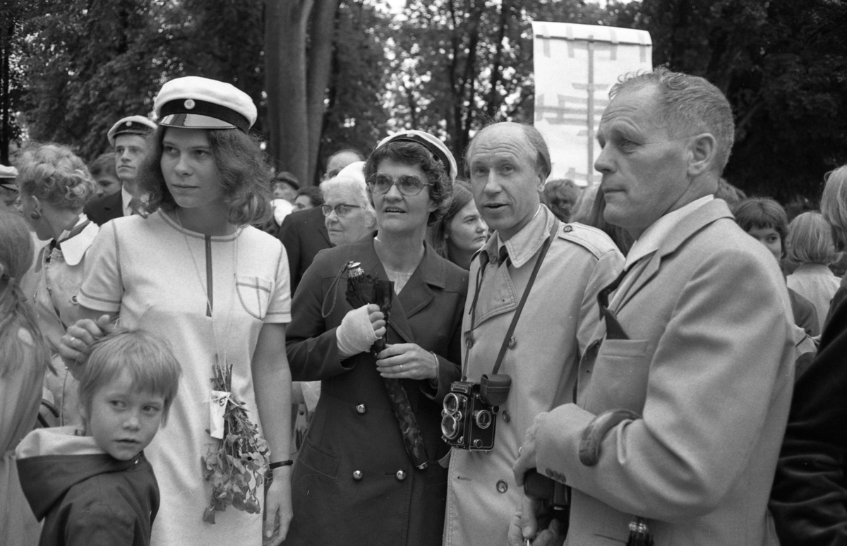 Studentdag. Familjen Erjö; dottern Margareta i studentmössa. Mamma Barbro Erjö bär också studentmössa. Pappa Lars Erjö har sin kamera om halsen. Längst till höger står Nils Karlsson, han är slöjdlärare på Engelbrektskolan. Många människor är samlade i Kyrkparken.