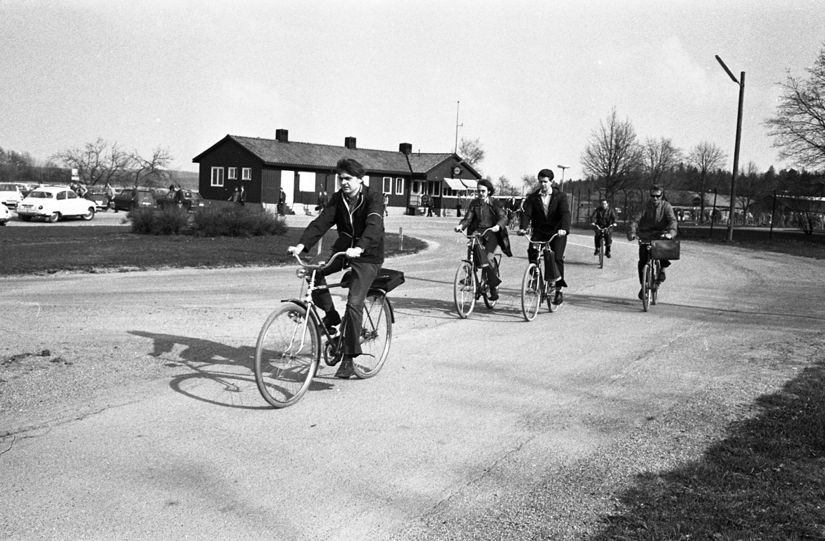 Arbetsdagen är slut på CVA, Centrala Verkstaden Arboga. Männen cyklar hem med sina matväskor på styret. Mitt i bild, med ljus skjorta, cyklar Ingvar Wadstedt och längst till höger kommer Hans Jansson (kallad "Kniven"). I bakgrunden ses bilparkeringen och byggnaden där vakten sitter.