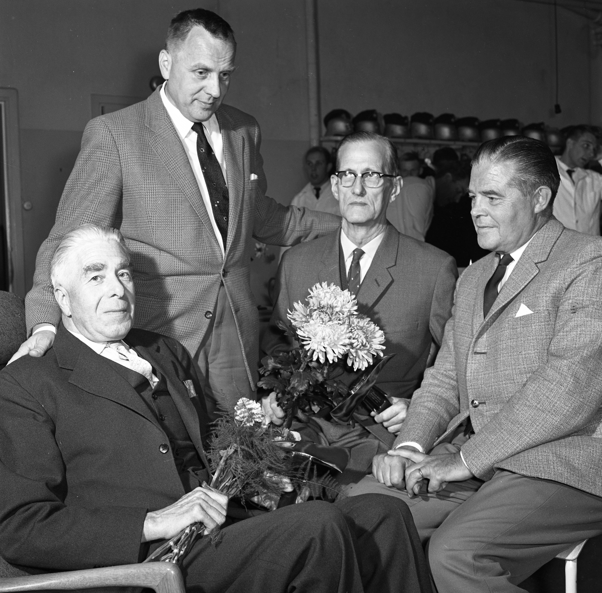 Mannen som står upp heter Ingvar Johansson och är ordförande i Brandstyrelsen. Mannen längst till höger är brandchef Gösta Jonsson.