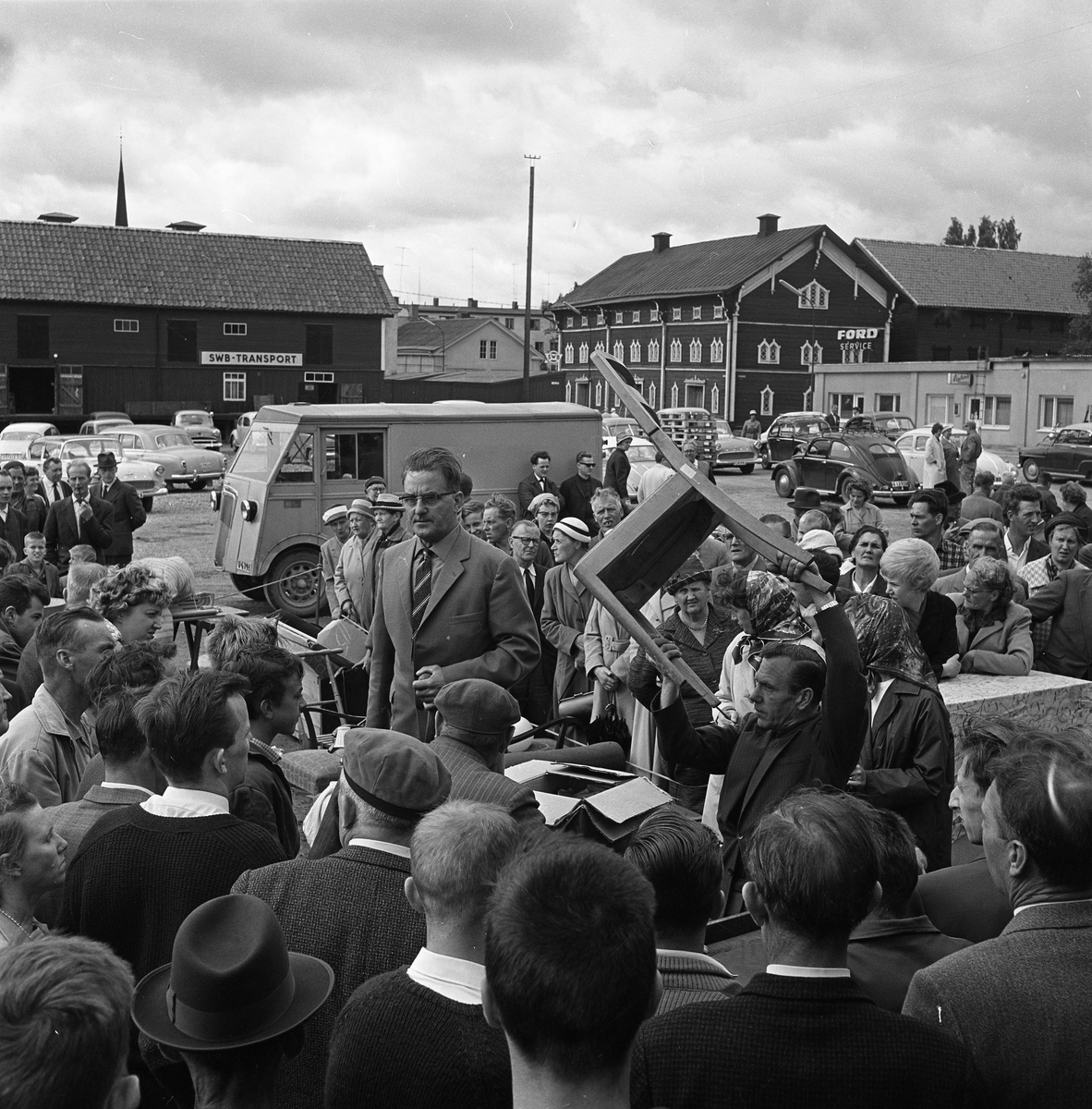 Auktion på Hamntorget. Auktionsförrättare med assistent som visar upp en stol. Publiken trängs. Bilar står parkerade på Hamntorget och längs Östra Hamngatan. I bakgrunden ses skylten till SWB Transport och ett hamnmagasin.