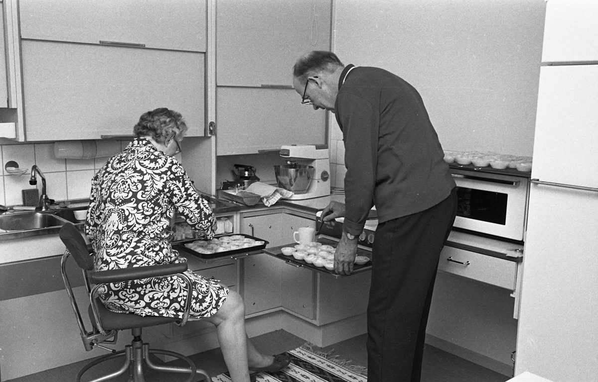 Inflyttningsklart i servicehuset på Storgatan. Köket är anpassat för en sittande person. Kvinnan sitter i en arbetsstol på hjul. Mannen och kvinnan penslar bullar som strax ska gräddas. I bakgrunden står en hushållsapparat och en kaffepanna.