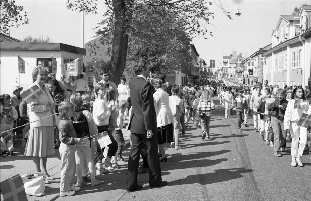 Skolbarn paraderar på Nygatan, österut. Många har flaggor i händerna. På trottoaren står människor och väntar.