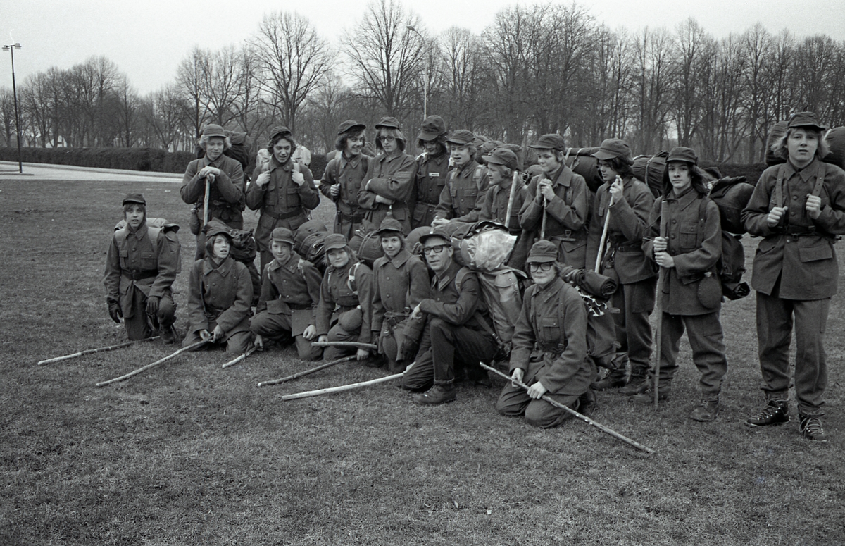 Titel: FBU, Frivillig Befälsutbildning Bakre raden, från vänster: okänd, Bertil Lundgren, Rolf Linde, Leif Larsson, okänd, Ove Ekstrand, Peter Andersson, okänd, Anders Fransson, okänd och Mikael Rickardsson Främre raden, från vänster: Olle Lack, okänd, Per Rudegård, Johansson, okänd, Gunnar Neuman (ledare) och Mats Dagerhäll. Uniformsklädda ungdomar med ryggsäckarna packade. De har var sin vandringsstav i handen. I bakgrunden ligger "gamla kyrkogården", mellan Lundborgsesplanaden och Arbogaån.