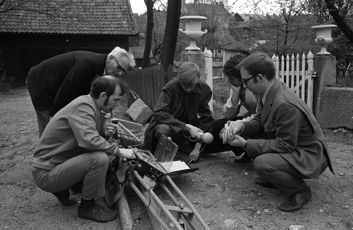 De är samlade runt en bandspelare. Platsen är gården på Västerlånggatan 1. Arbogaån anas bakom lusthuset.