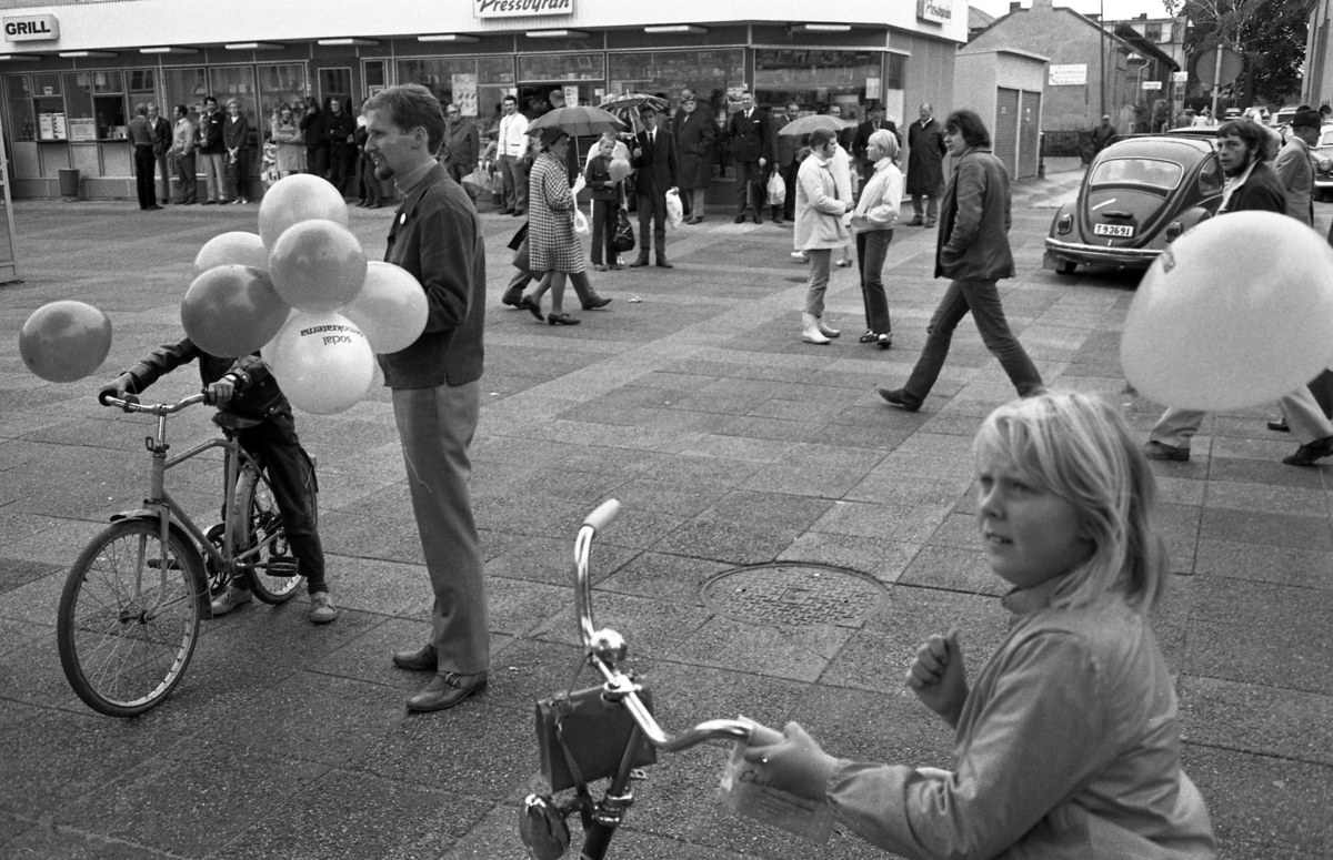 Mannen med ballongerna är Per-Olov Nilsson. Det är mycket folk i rörelse på torget. En del har paraply. I förgrunden ses några barn med cyklar.