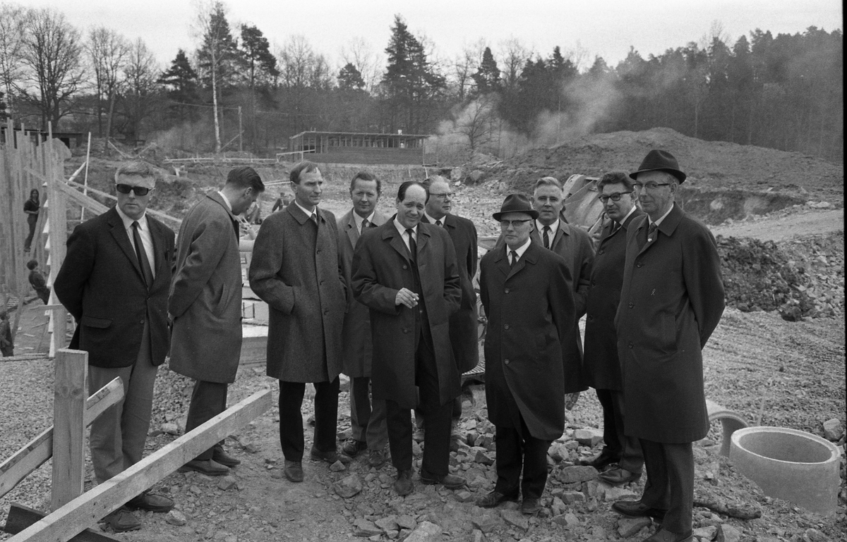 Herrar i vit skjorta och slips ser på byggplatsen för det nya badet i Ekbacken.