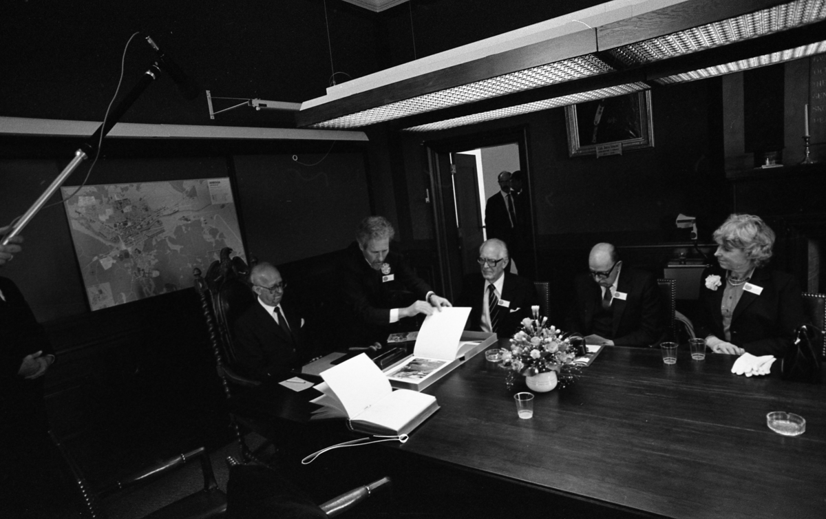 Runt bordet, från vänster: i den snidade karmstolen sitter Ingemund Bengtsson (riksdagens talman, socialdemokrat), Per-Olov Nilsson (Arbogas kommunalråd), Anders Dahlgren (bytte detta år från 2:e till 3:e vice talman, centerpartist), Karl-Erik Eriksson (bytte detta år från 3:e till 2:a vice talman, folkpartist) och Ingegerd Troedsson (1:e vice talman, moderat)
