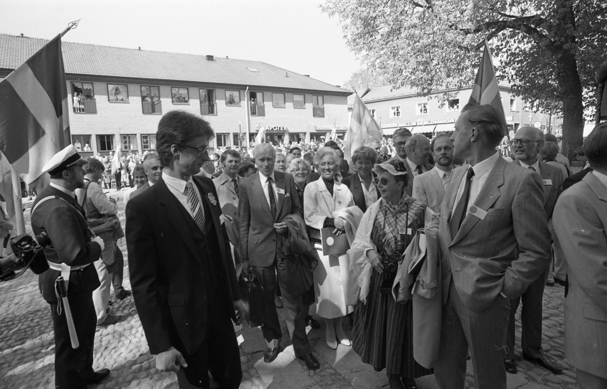 Riksdagsjubileet. I Arboga firas 550-årsminnet av Sveriges första riksdag. Politiker, så väl lokala som på riksplanet, är på väg in i Heliga Trefaldighetskyrkan. Den långe, mörke mannen till vänster är Tomas Högström, moderat politiker från Västerås, Gösta Bohman, före detta partiledare för Moderaterna, Birgit Johansson, moderat lokalpolitiker, i folkdräkt.