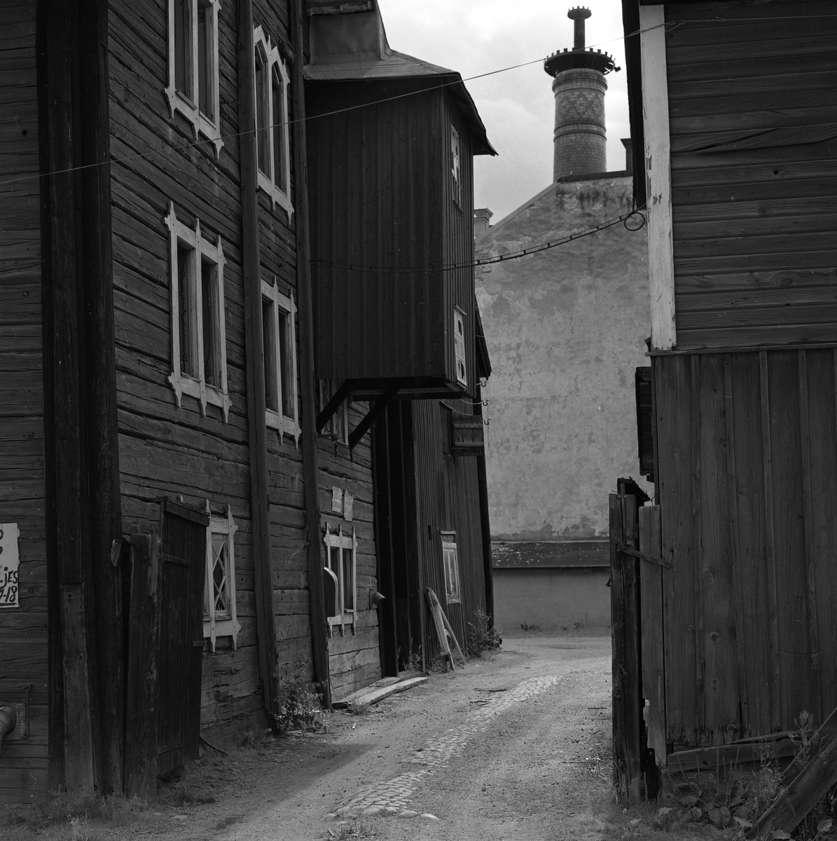 Arboga Kvarn och Maltfabrik, del av exteriör. Den dekorativa skorstenen syns ovanför gaveln. Magasin i förgrunden. Anläggningen är tagen ur bruk.