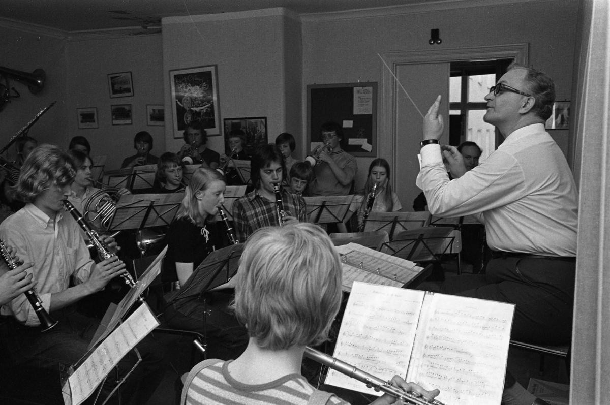 Ungdomsorkestern repeterar under ledning av Karl-Axel Göransson. Det spelas på klarinett, tvärflöjt, fagott och trumpet.