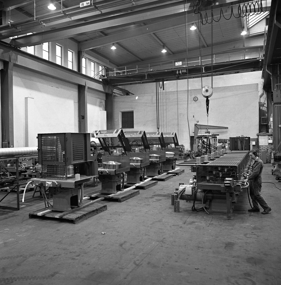 Arboga Mekaniska Verkstad. Interiör från Meken. En man arbetar i en fabrikslokal. Det hänger en travers i taket. Många maskiner ryms i rummet.