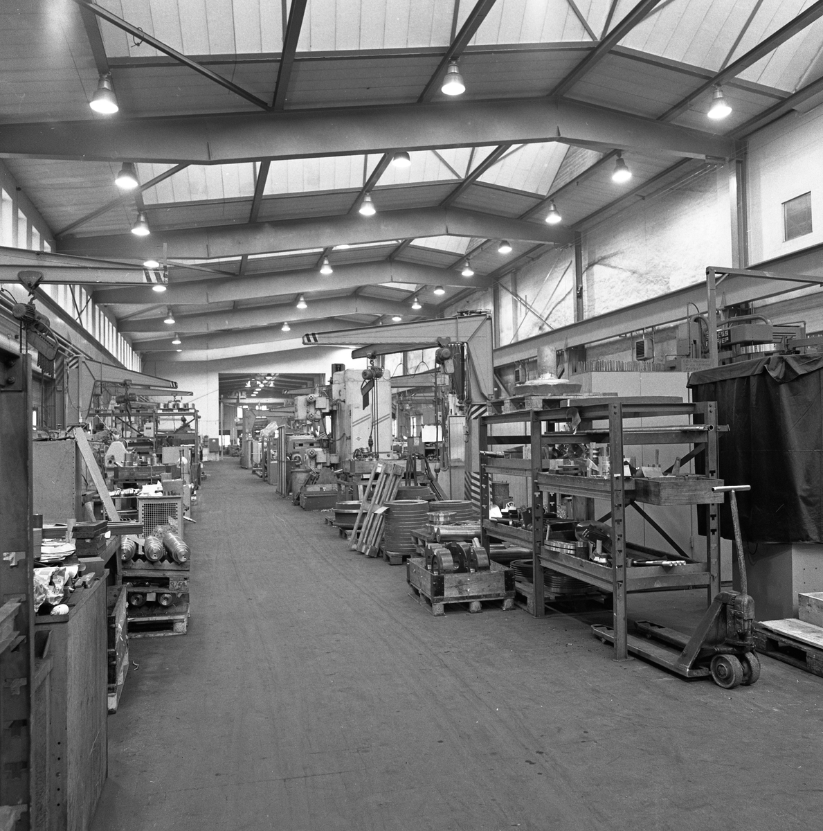 Fabrikslokal med maskiner och hyllor med maskindelar.