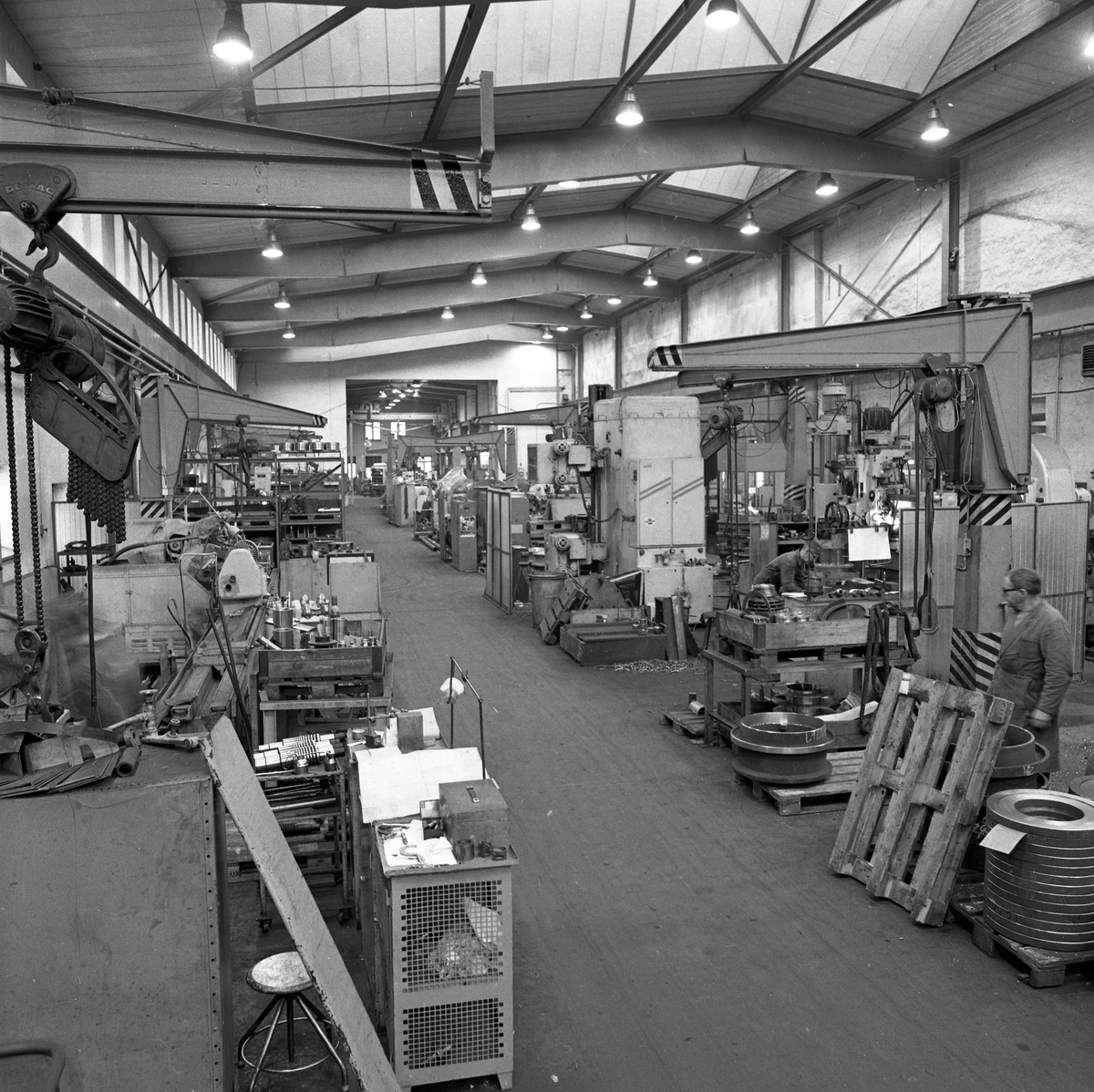 Arboga Mekaniska Verkstad, Meken, interiör. Två män arbetar i fabrikslokalen. Här ses maskiner, lastpallar och maskindelar.