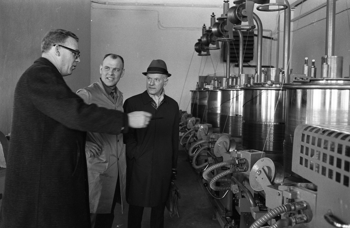 Arboga Mekaniska Verkstad har besök av en kund. Personalen demonstrerar tråddragmaskiner. Till vänster Sverre Larsen och i mitten Gotthard Larsson.