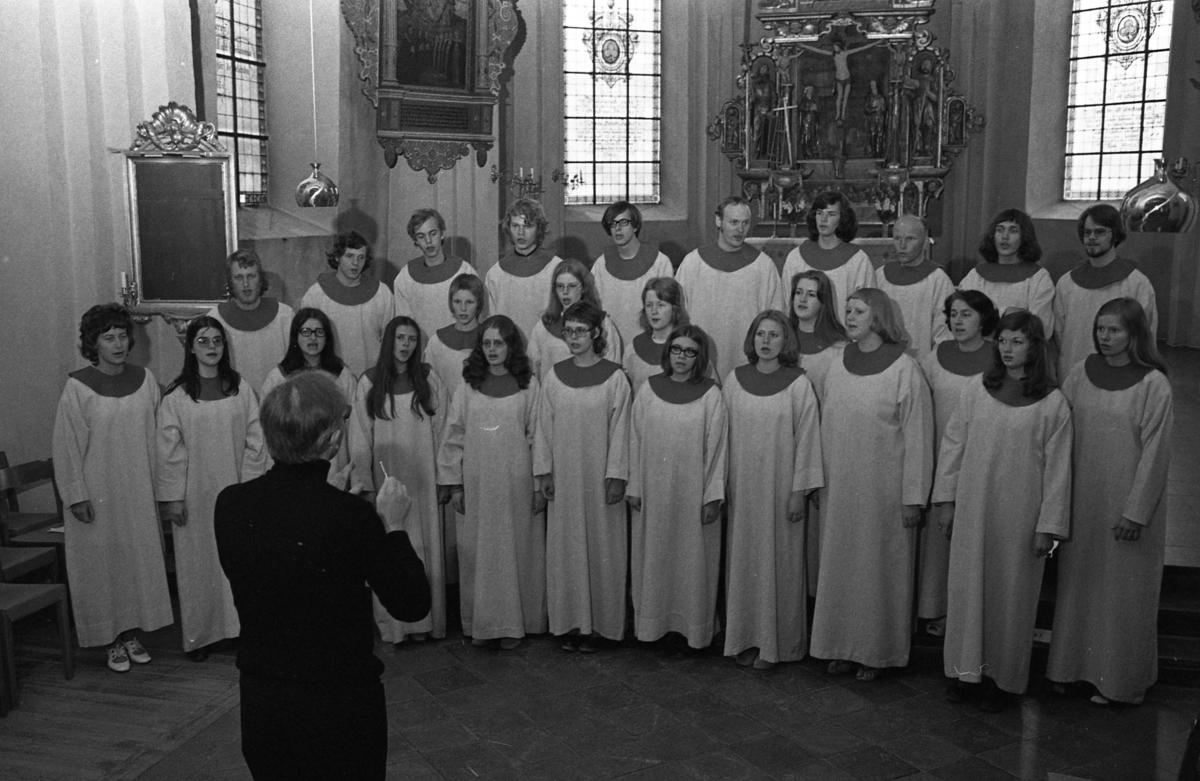Kör som sjunger i koret i Heliga Trefaldighetskyrkan. De har kåpor och kragar på sig. Dirigent är Bertil Stoltz.