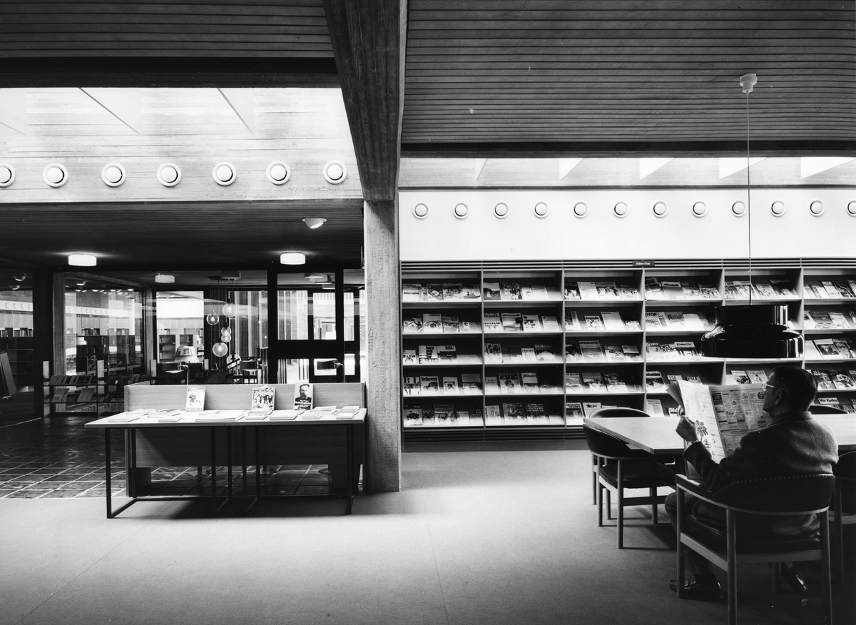 Arboga Stadsbibliotek, interiör. Entrén till biblioteket ses till vänster. Till höger står hyllorna med tidskrifter. En man sitter och läser en dagstidning vid det stora bordet. De stora fönstren, mot Arbogaån, ligger utanför bilden, till höger.