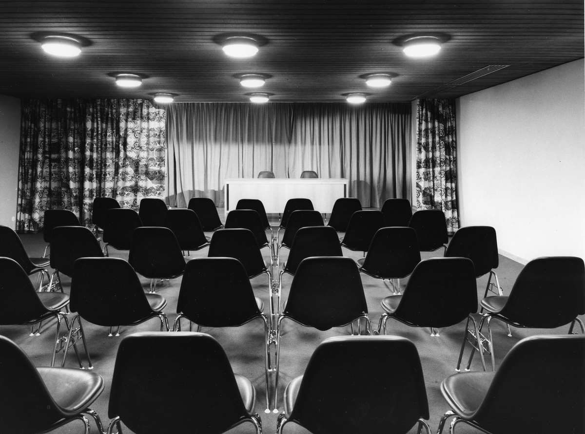Uppställda plaststolar i förgrunden. Längst bak, i bilden, ses podiet med draperier / ridåer.