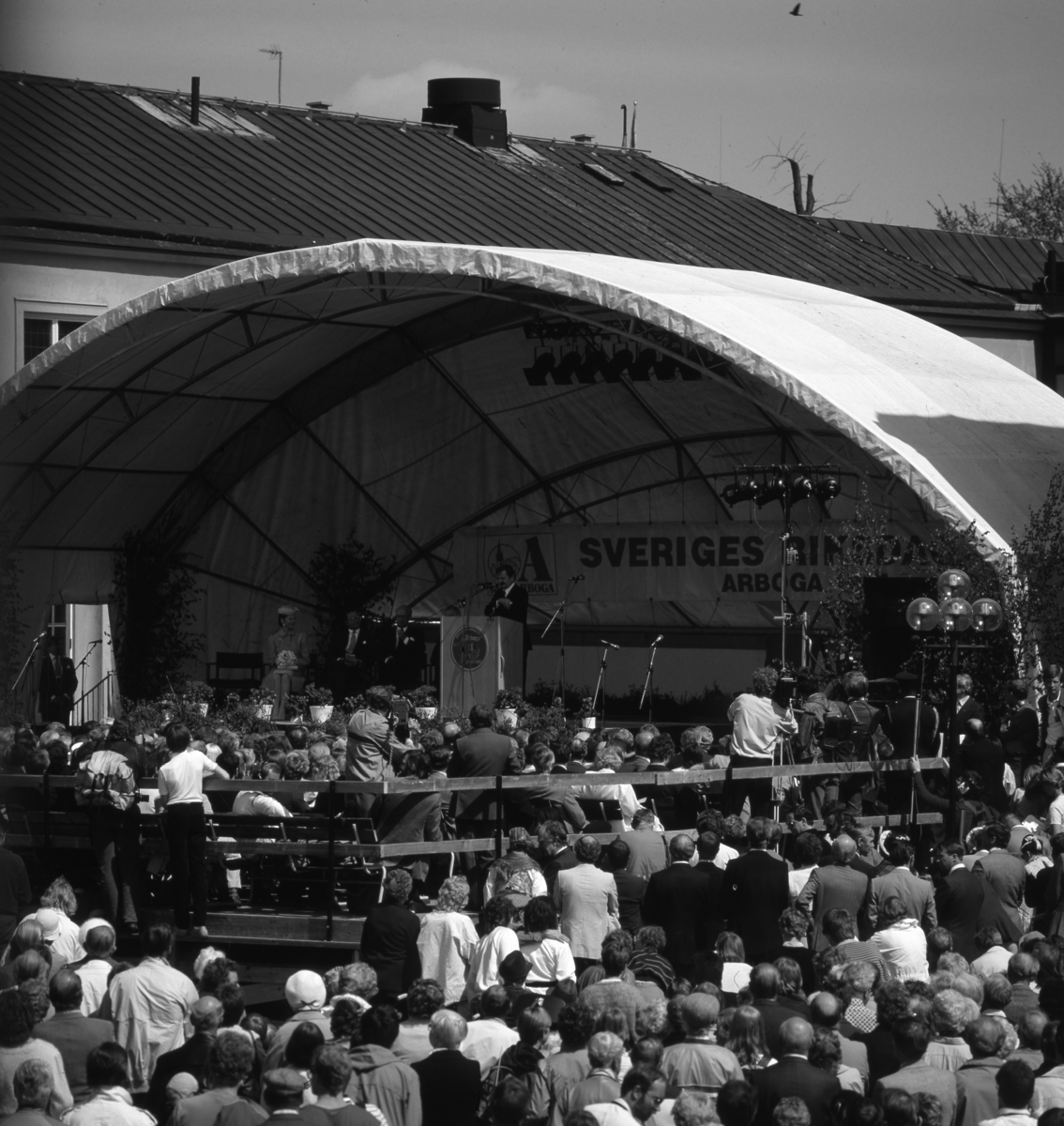 Statsminister Olof Palme talar på 550-årsjubileet av Sveriges första riksdag. På scenen sitter drottning Silvia, kung Carl XVl Gustaf, talman Ingemund Bengtsson och Bertil Karlsson (skymd).
