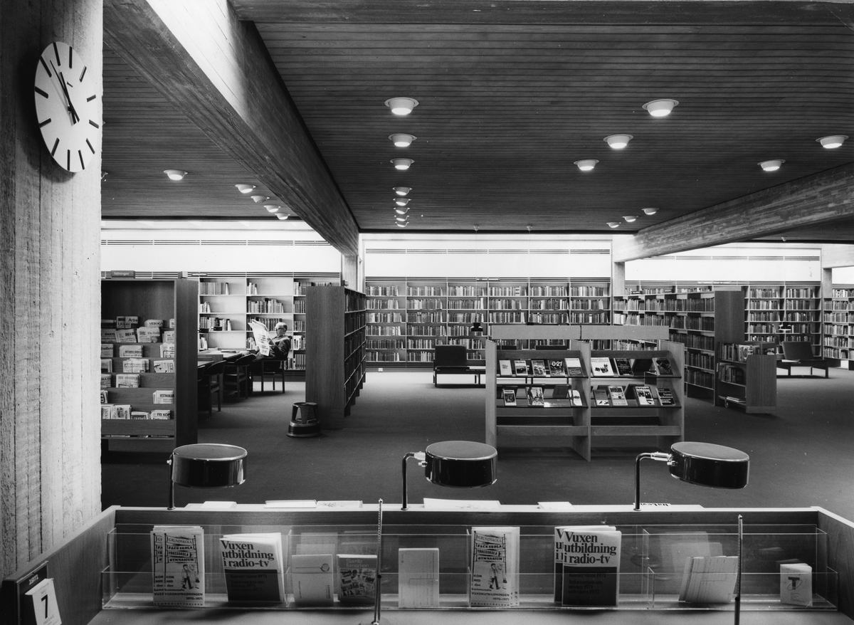 Arboga Stadsbibliotek, interiör. Fotografen har entrén bakom ryggen. Bilden är tagen ut i stora bokhallen. Bokhyllor med böcker, från golv till tak.