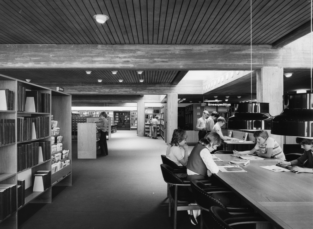 Arboga Stadsbibliotek, interiör. Bokhallen. Fotografen har ryggen mot de stora fönstren mot Arbogaån. Barnen sitter vid det stora bordet vid tidskriftshyllorna (utanför bild, till höger). Lånedisken syns till höger. De bortersta bokhyllorna, rakt fram, står i facksalen.