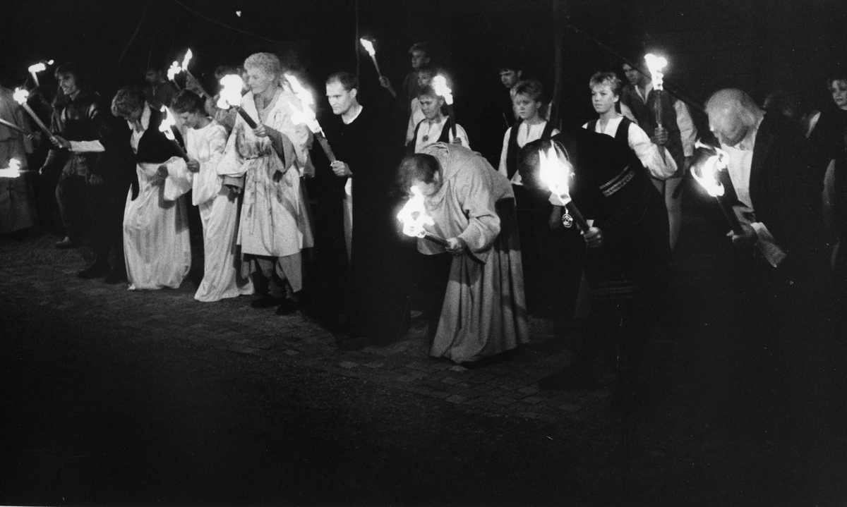 Bygdespelets Vänner tackar för applåderna. De har just framfört skådespelet "Giv oss fred" på museets innegård. De två bröderna; Lasse Sommar (längst till vänster) och Florentin (blond, med ljus särk och fackla i handen) har ledande roller. Florentin spelas av Matts Deubler/Mats Deubler.