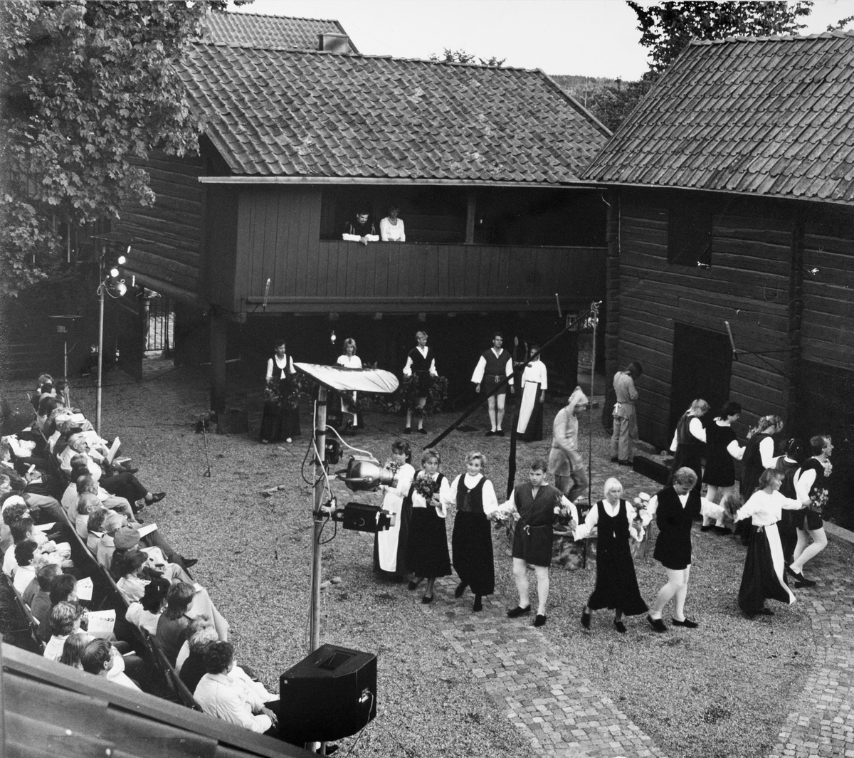Giv oss fred, även kallat Arbogaspelet, spelas på museets innegård. Publik och aktörer. På loftgången står Engelbrekt Gertsson, spelad av Stig Eriksson.