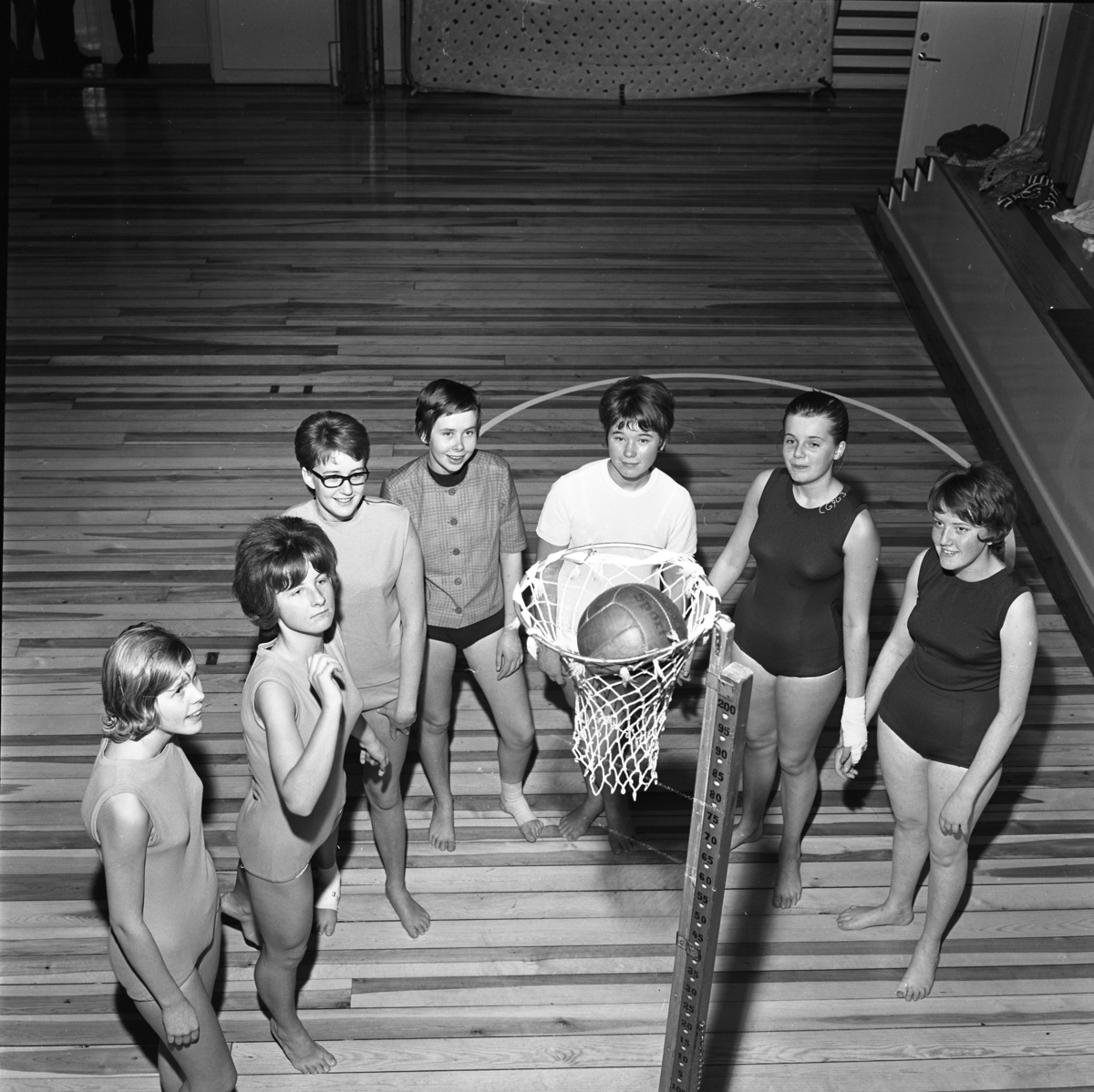 Korgboll/Basket i Engelbrektskolan. Flickor samlade runt basketkorgen.