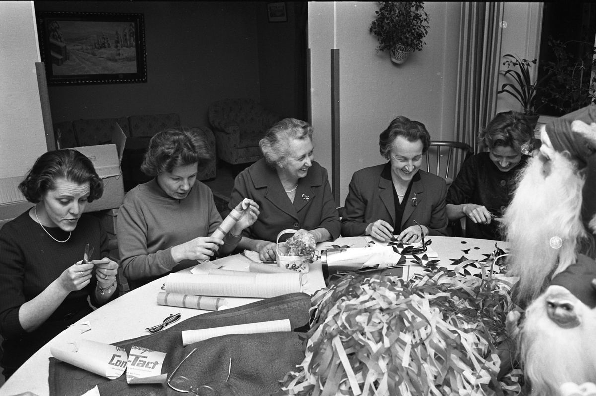 Lions damer julpysslar med silkepapper, tomma köksrullar och snören. En hög med julgranskarameller ligger på bordet. Där tronar även två skäggiga tomar.