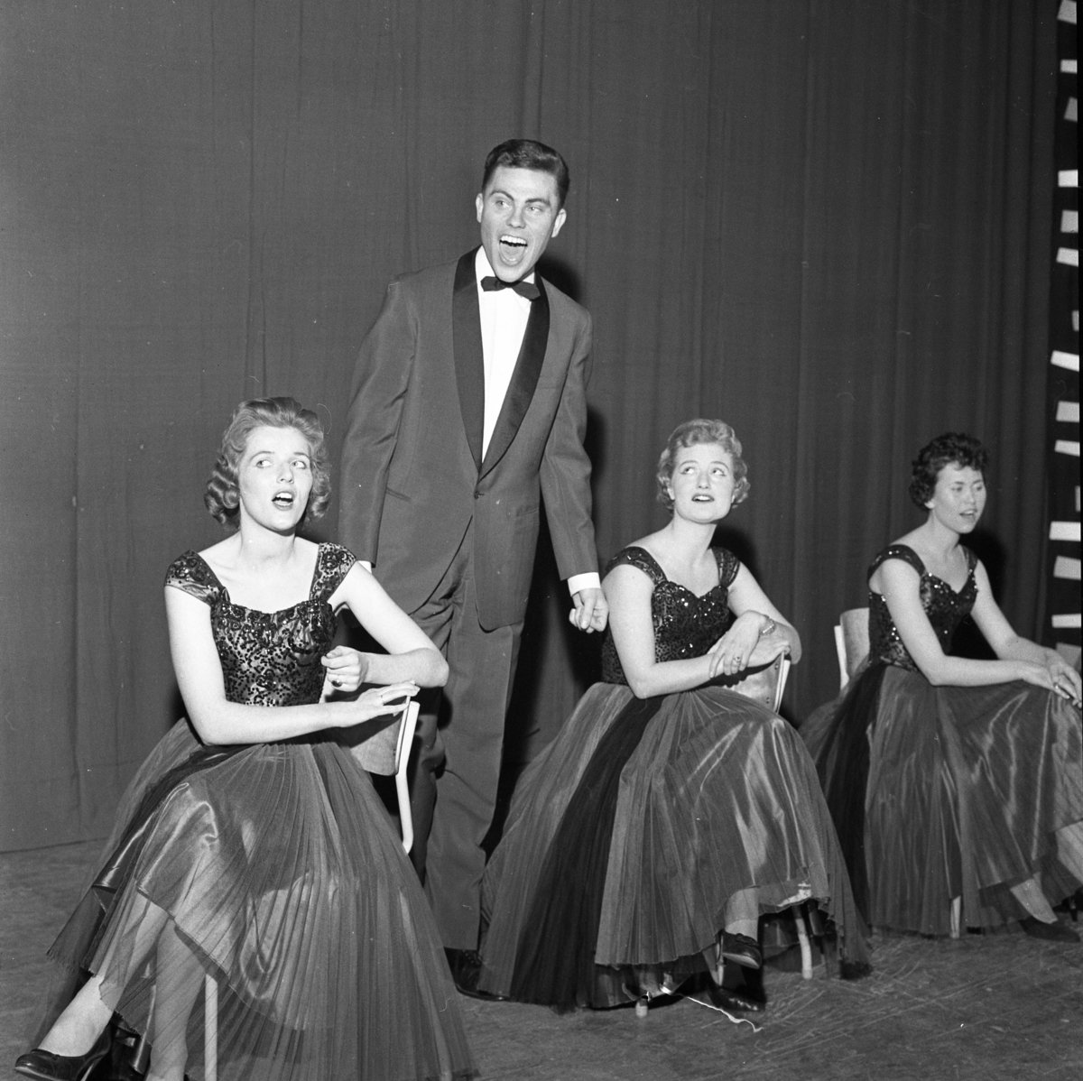 Benkt Engstrand, i smoking. Kvinnorna i aftonklänningar är, från vänster: okänd, Mona Jansson och Berit Österberg.