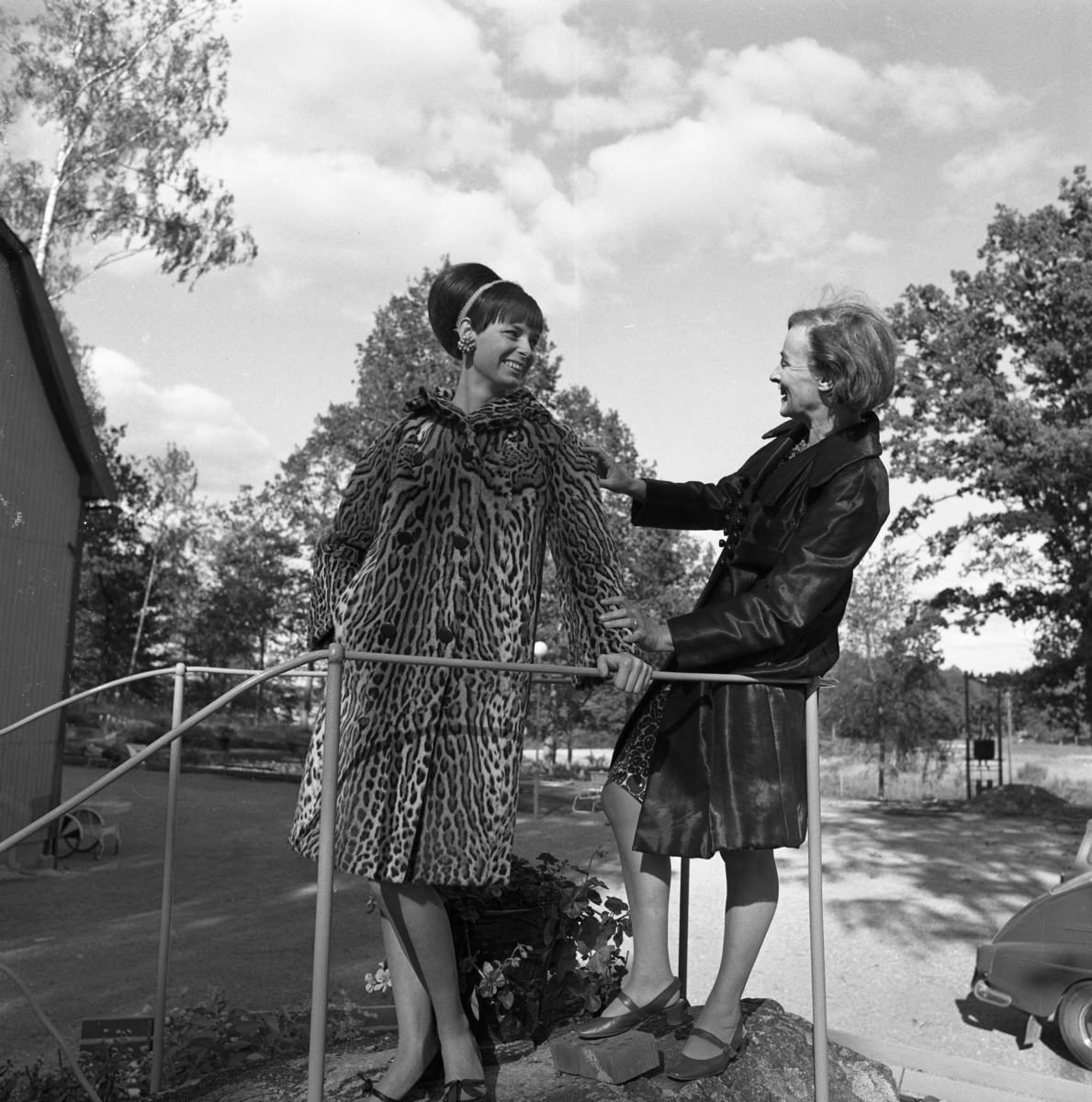 Mannekäng visar en djurmönstrad kappa. Bredvid står Britt-Marie Utterström från Ateljé Touché.
