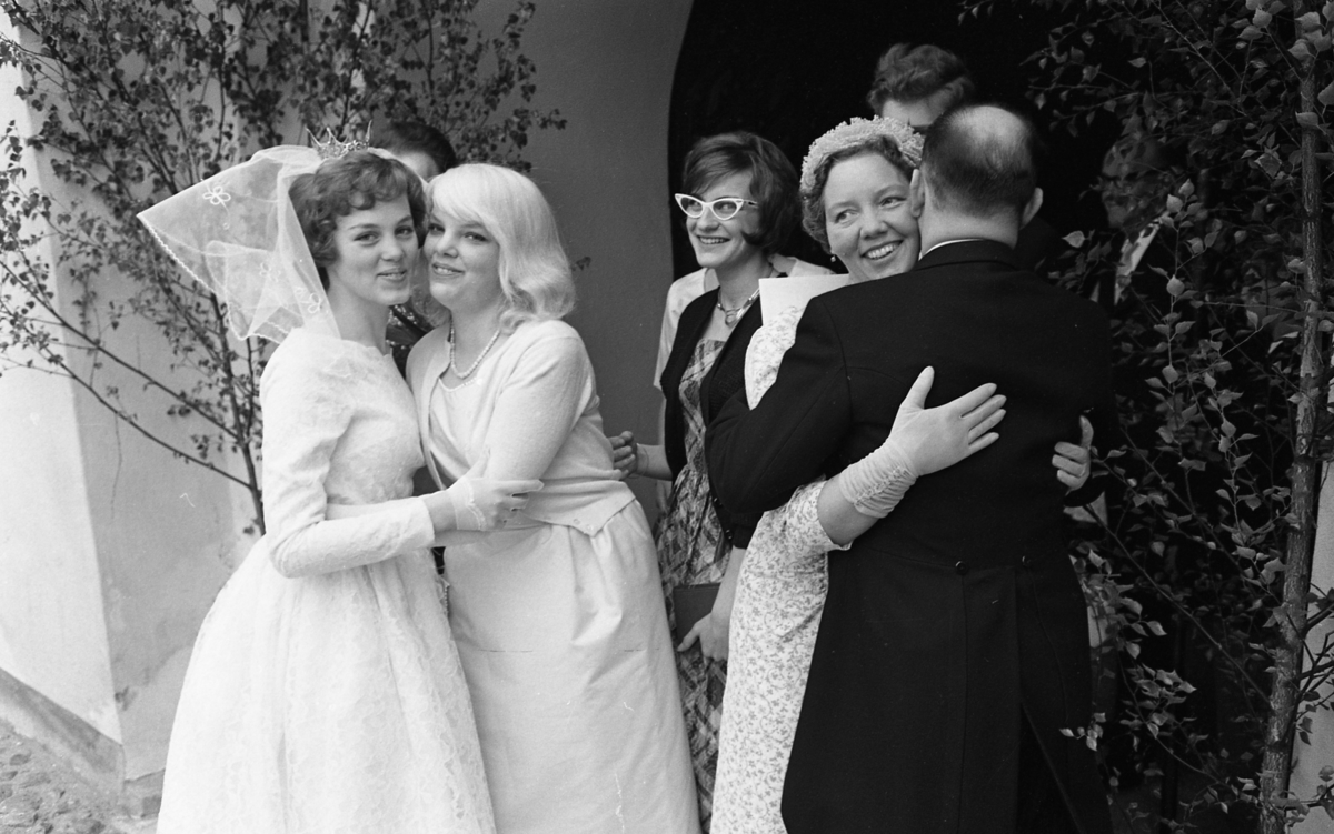 Margareta har just gift sig med Rune Ström (mannen i frack, med ryggen mot fotografen). Rune får en kram av svärmor; Ingrid Pettersson. Genom kyrkporten kommer Harriet Malmberg Svanberg.
