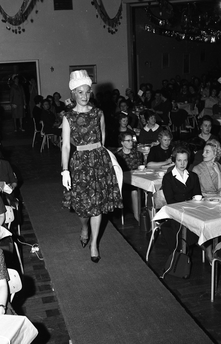 Öhrman och Melander har modevisning på Folkan/Medborgarhuset. Mannekängerna är den egna personalen samt medlemmar från Arboga Lottakår. Kvinnan på röda mattan bär klänning, handskar och hatt. Kappan håller hon i handen. Publiken utgörs endast av kvinnor. De sitter vid bord och dricker kaffe.