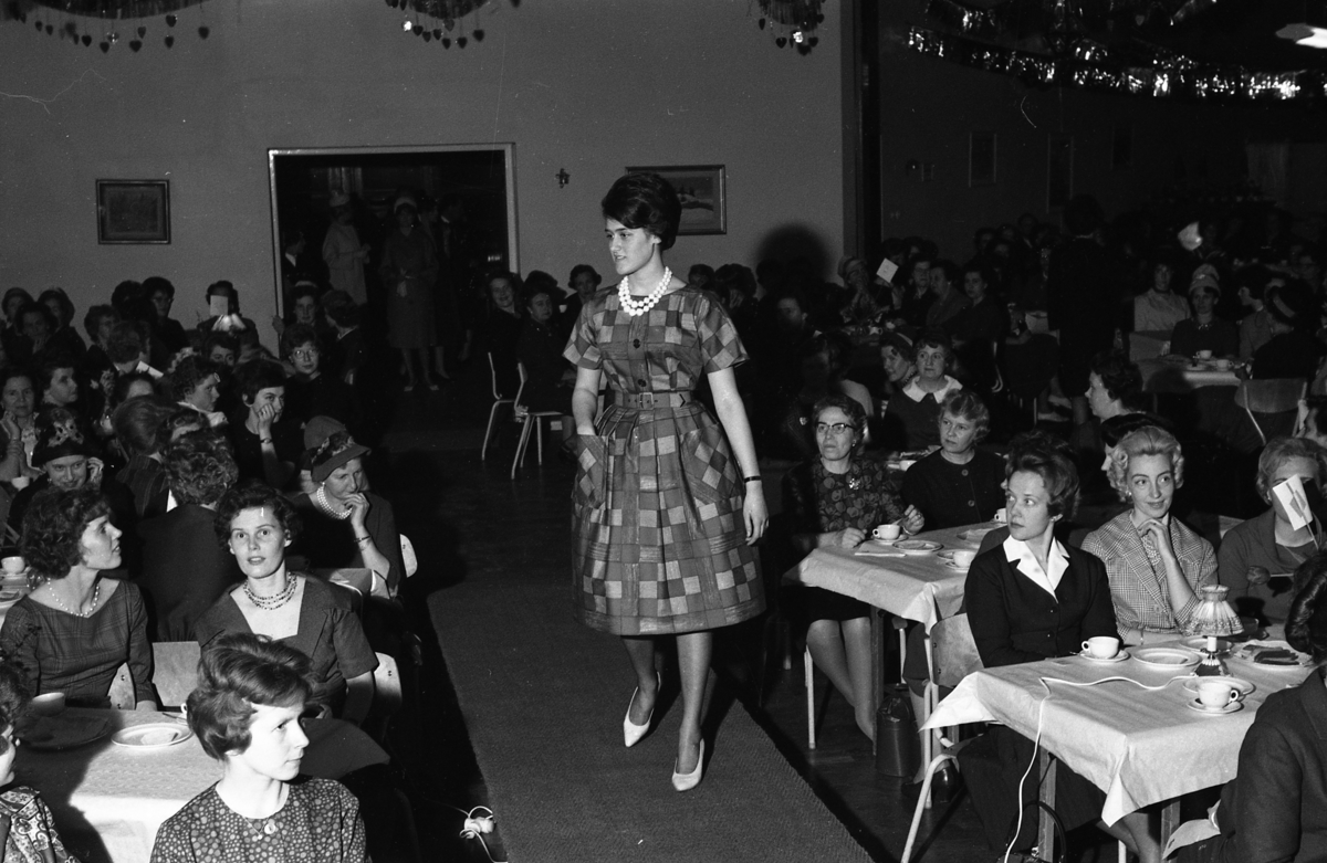 Öhrman och Melander har modevisning på Folkan/Medborgarhuset. Personal och medlemmar i Arboga Lottakår ställer upp som mannekänger. Här visar Gunilla Strindler en klänning med skärp i midjan och vidd i kjolen. Publiken sitter vid bord och dricker kaffe.