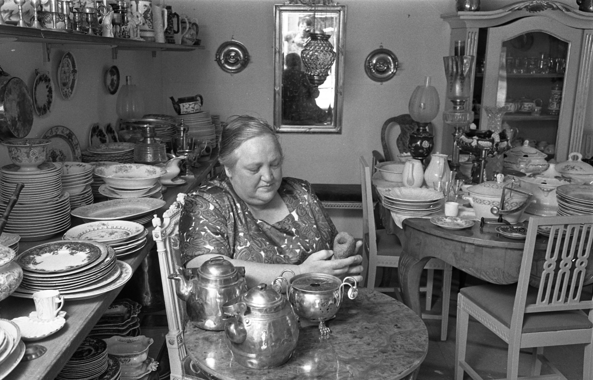 Kvinna som säljer aktikviteter. Här är hon omgiven av porslin, kopparkannor och diverse möbler