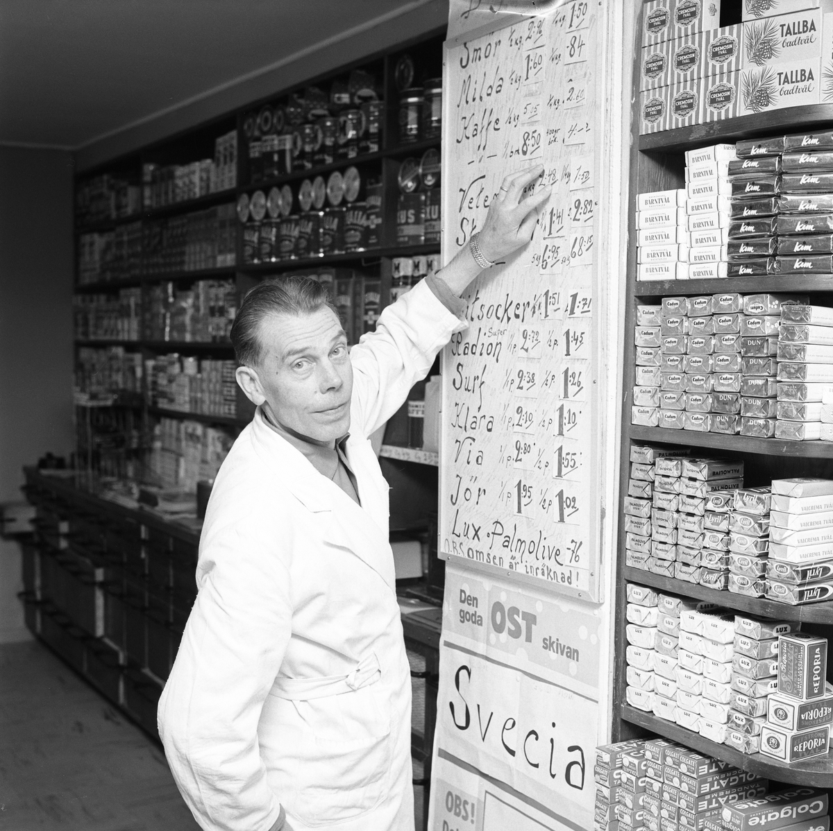 Yngve Anderssons speceriaffär på Hamrevägen. Handelsboden har varor i hyllorna och prislistor på väggen.