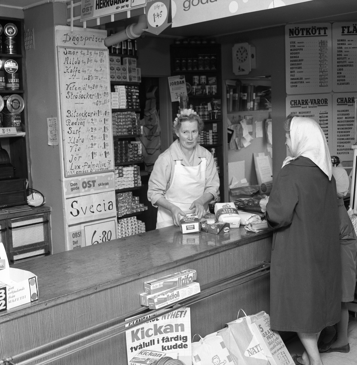 Yngve Anderssons speceriaffär på Hamrevägen. En kvinna köper varor över disk i handelsboden. Expediten är klädd i förkläde. Prislistor på väggen.