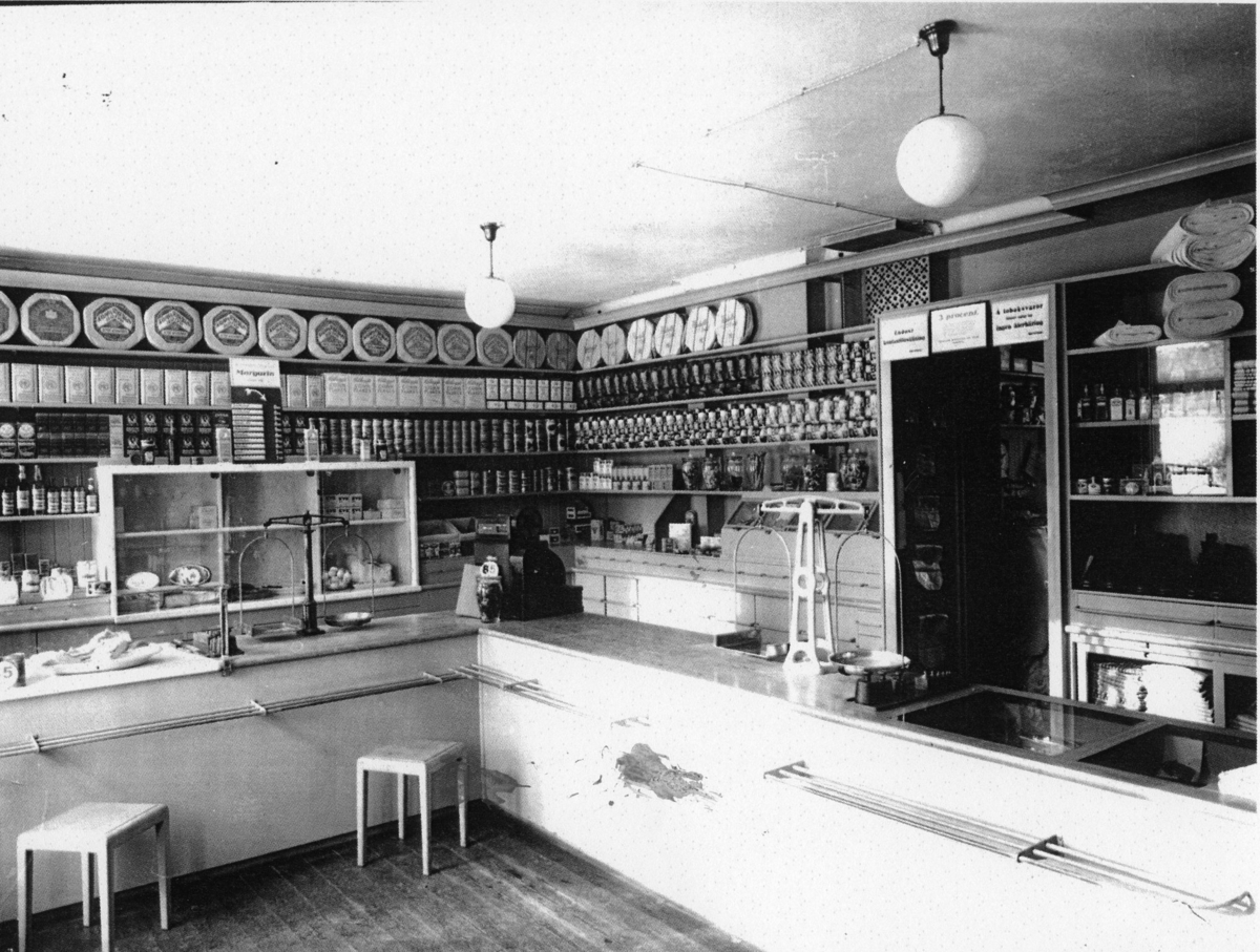 Handelsbod, diskar in vinkel. Kassaapparat i hörnet, en våg på varje disk. Specerier på hyllorna till vänster och tygrullar till höger.