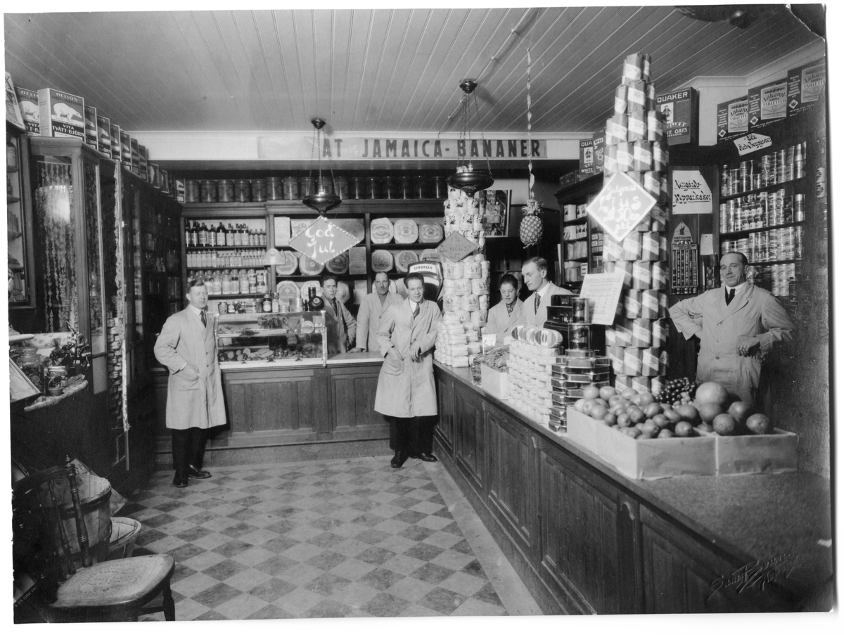 Handelsbod med sju personer i personalen. Alla är klädda i arbetsrock. Här säljs tvättmedlet Tvätt-Björn, julgransljus och även bananer. Varorna är staplade i pyramider på disken.
