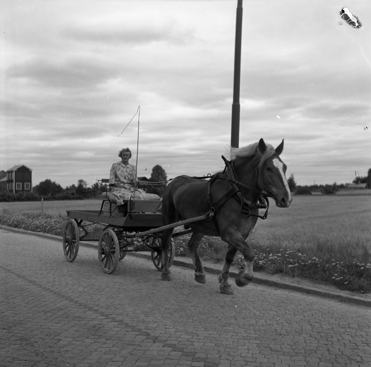 En kvinna kör häst och vagn på Jädersvägen. Det är sommar och hon har klänning på sig och har en piska i handen.