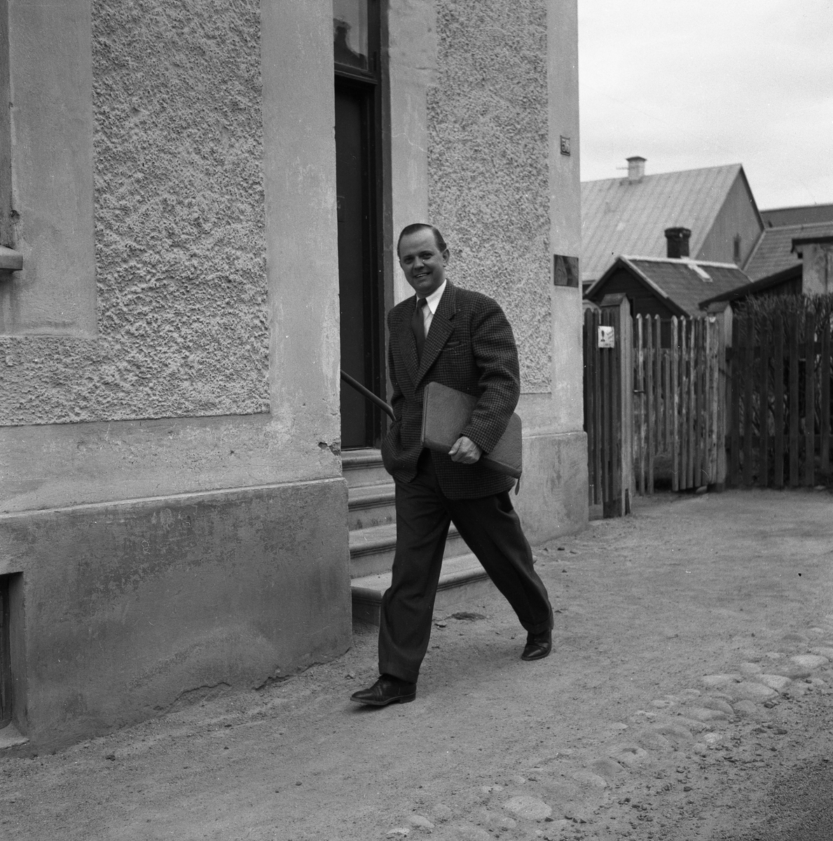 Man, klädd i kavaj och med en portfölj under armen, utanför tidningshuset.