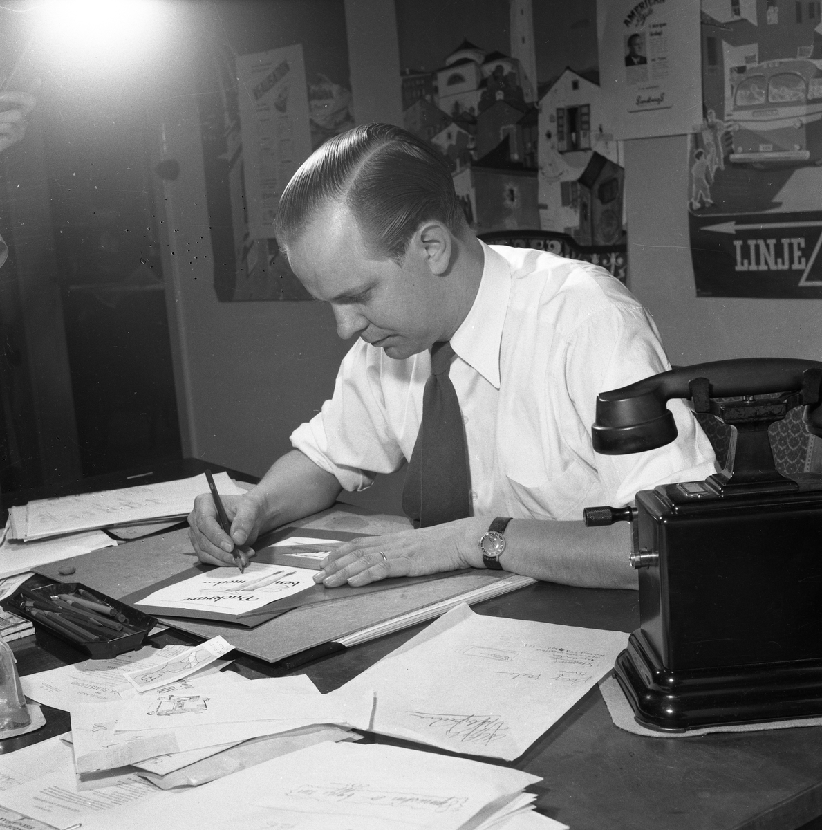 En man, iklädd skjorta och slips, sitter vid ett skrivbord. Han håller i en penna och skissar på ett papper. På bordet ligger papper utspridda, där finns ett pennfat och en telefon. På väggen bakom mannen hänger affischer.