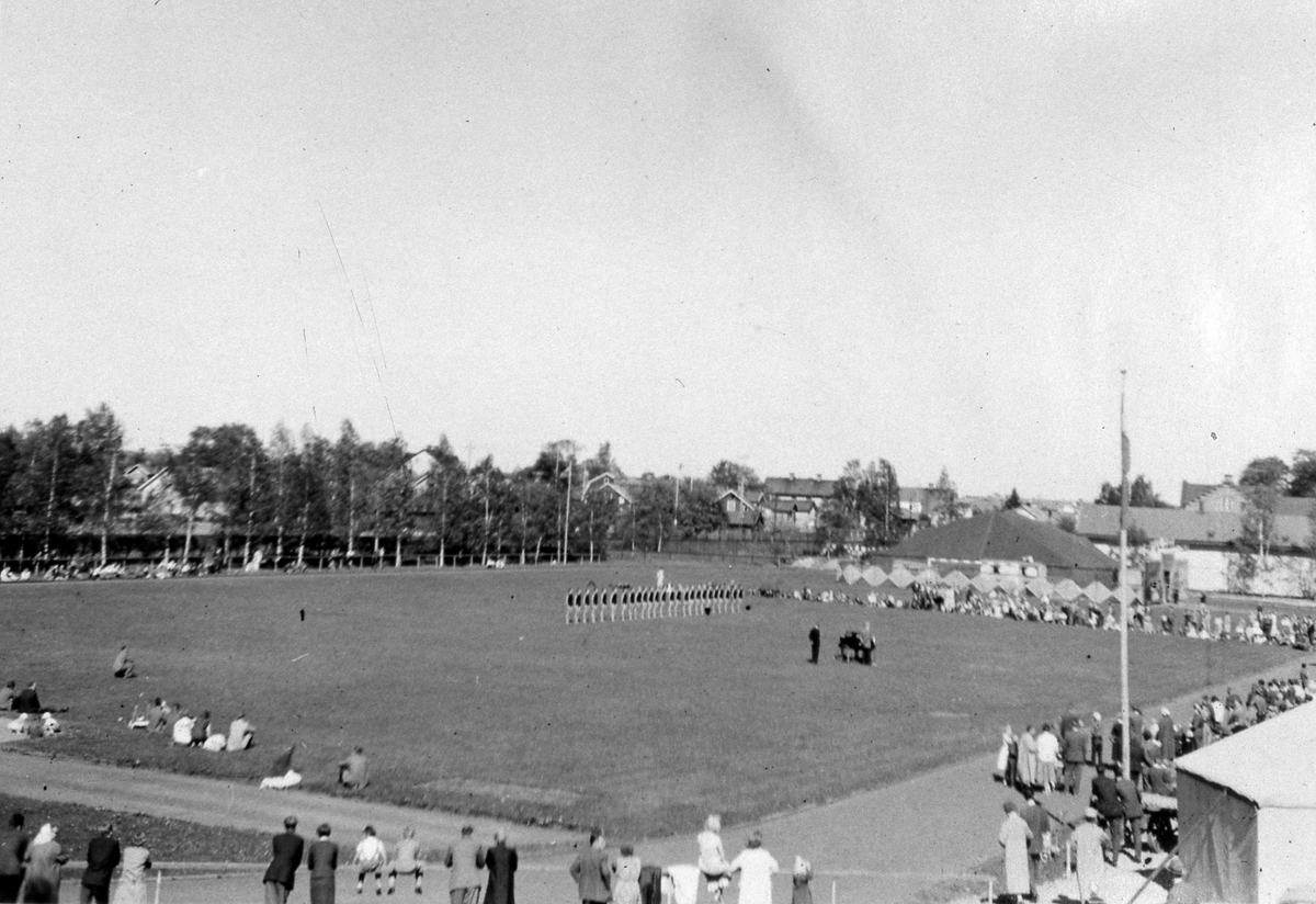 Gymnastikuppvisning på Sturevallen under Arbogautställningen. En grupp kvinnliga gymnaster står i rad på idrottsplanen. Bortanför dem ses ett tält. I bakgrunden ses bebyggelsen, till höger skymtar Arboga Margarinfabrik.