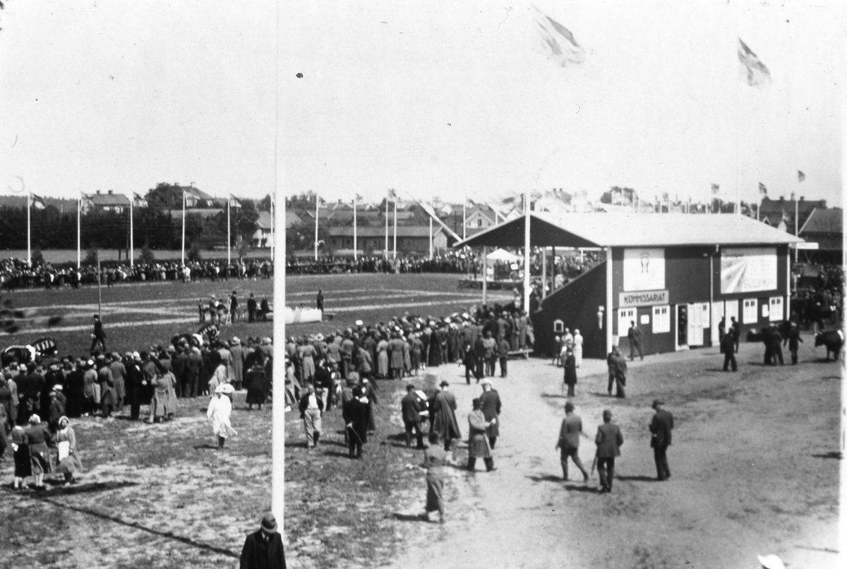 Lantbruksutställningen pågår under tre dagar, som ett inslag i Arbogautställningen. En stor publik är samlad. Två hästar ses på Sturevallen. En ko skymtar till höger i bild. I läktarbyggnaden finns kommissariatet.