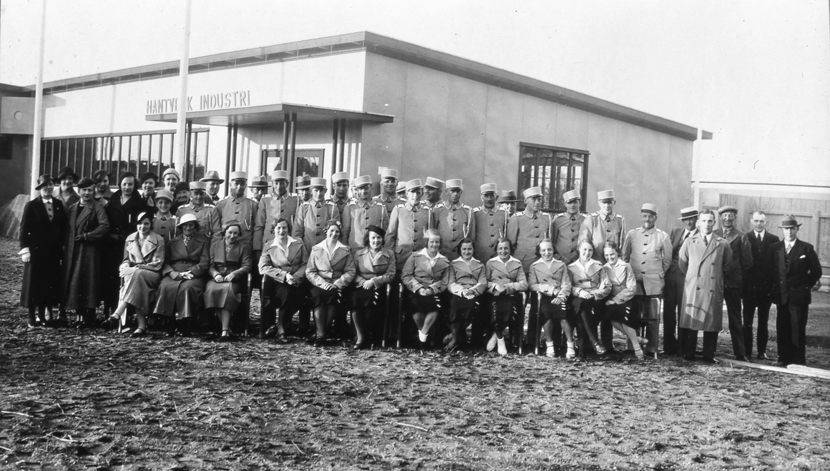 Gruppfoto av alla lokala funktionärer, under Arbogautställningen, i sina uniformer. De är samlade framför utställningsbyggnaden "Hantverk Industri". Till vänster står några civilklädda kvinnor och till höger en grupp civilklädda män.