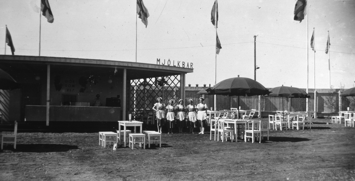 I entrén till Arbogautställningen ligger denna Mjölkbar. Servitriserna står uppställda utanför, iklädda hättor och förkläden. Bord och stolar är uppställda i väntan på gäster. Några sittgrupper är försedda med parasoll. Flaggorna är hissade. Gästerna kan komma!