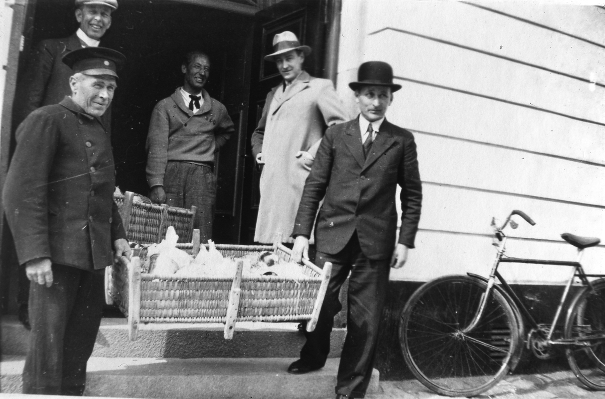 Den nedre korgen bärs av Andersson som är kusk på Koberg och Birger Andersson, vaktmästare på Rådhuset. Intill trappan står en herrcykel.